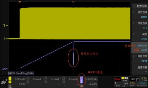 這個時候用ZDS4000系列示波器新開發(fā)獨特的占空比趨勢測量功能,將每一個PWM波的占空比顯示在屏幕上,點擊示波器數(shù)學運算Math按鍵,模式選擇趨勢圖,類型選擇占空比,示波器會自動檢測PWM波的周期和閾值,無需過多設置,就可以快速出波形,波形如圖5所示。屏幕上除了通道1,還多了MATH通道,顏色為紫色,MATH通道顯示的即是占空比趨勢,可以看到占空比緩慢遞增后大約在屏幕中間位置出現(xiàn)了異常。和通道1一樣,MATH通道也可以調節(jié)垂直檔位和偏移。