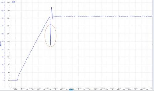 某使用PWM波形驅動的直流電機在加速過程中存在微小抖動情況,觀察電機轉速波形如圖3所示,開始加速后大約在3.6秒轉速出現(xiàn)一個下拉動作。電機PWM調速原理是通過改變接通脈沖的寬度,使直流電機電樞上電壓的占空比改變,從而改變電樞電壓的平均值,控制電機的轉速。因此基本可以確定這個轉速下拉動作是由于PWM波占空比出現(xiàn)異常引起的。