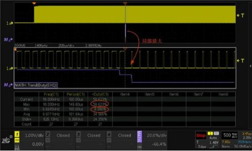 定位到占空比異常位置后,開啟示波器縮放模式下ZOOM多窗口顯示功能,對信號進行局部放大,如圖6所示,可以清晰的看到占空比異常的細節(jié),同時開啟對ZOOM1窗口數(shù)據的測量和統(tǒng)計,可以看到占空比從正常的59.62%變?yōu)?.99%左右。