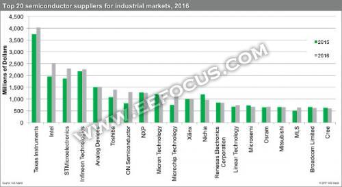 在預測2017年經濟狀況繼續(xù)改善的同時,IHS Markit列出了以市場份額排名的工業(yè)半導體市場前20強。