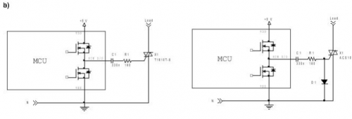 使用正電流驅(qū)動SCR很容易。如果SCR的陰極連接VSS端子,如圖1a所示,當控制電路(通常是微控制器)的輸出引腳置高電平時,控制電路向SCR柵極輸出電流。