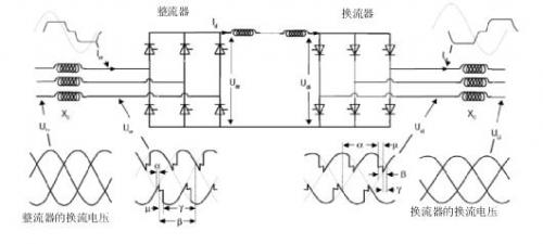 由于晶閘管只能接通,不能斷開,因此交流電壓會(huì)使晶閘管發(fā)生反向偏置并停止傳導(dǎo)。因此,LCC中的晶閘管的偏置取決于電網(wǎng)AC側(cè)用于換流的功率。在晶閘管正向偏置后導(dǎo)通時(shí)的延時(shí)決定了相位角延遲(觸發(fā)角)。晶閘管的相位角延遲實(shí)現(xiàn)了交流波的相位角控制。