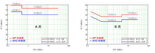 圖 1:使用準(zhǔn)峰值和平均值檢測器的 EN 55022 A 類和 B 類傳導(dǎo)發(fā)射限值。