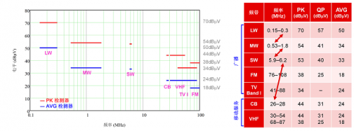 CISPR 25 測試的傳導(dǎo)發(fā)射均在 150kHz 至 108MHz 頻率范圍的特定頻帶內(nèi)進(jìn)行測量。具體而言,調(diào)節(jié)頻率范圍分布在 AM 廣播、FM 廣播和移動服務(wù)頻帶之間,如圖 2 中的圖象和表格所示。圖 2 還繪制了 CISPR 25 5 類(最嚴(yán)苛的要求)的相關(guān)限值圖象。盡管頻帶之間的帶隙允許更高的噪聲尖峰,但汽車制造商可能會根據(jù)其特定的內(nèi)部 EMC 要求選擇擴(kuò)展這些頻率范圍。這些要求通常基于國際 IEC 標(biāo)準(zhǔn),僅更改不同測試或限值的少量參數(shù),其核心內(nèi)容保持不變。