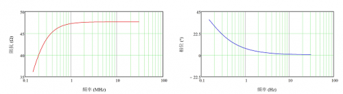 對于使用 EMI 接收器或頻譜分析儀進(jìn)行的測量,噪聲信號可通過高通濾波器網(wǎng)絡(luò)(如圖 3 所示)獲得,該網(wǎng)絡(luò)的耦合電容為 0.1μF,放電電阻為 1kΩ,測量端口的端接電阻為 50Ω 。圖 4 顯示了在 150kHz 至 30MHz 的頻率范圍,(50μH + 5Ω) || 50Ω LISN 的模擬阻抗圖。