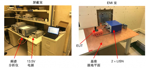 圖 6:使用兩個單極 LISN 和銅箔接地平面的 CISPR 25 傳導(dǎo) EMI 測試裝置。
