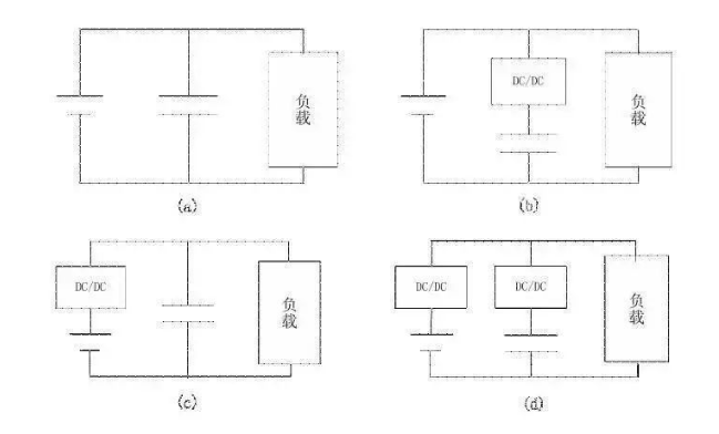 與超級(jí)電容配合使用的DCDC,在整車電源中的位置如下圖所示,它可能出現(xiàn)在圖(b)、(c)、(d)中所示位置上,而(b)是應(yīng)用較多的一種形式。