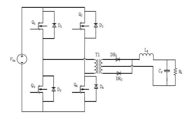 上圖中,Vin為輸入電壓,需要通過(guò)DCDC回路,在輸出端得到一個(gè)需要的輸出電壓。原邊開關(guān)電路,將輸入電流調(diào)制成矩形波,這個(gè)過(guò)程主要依靠控制器調(diào)制特定占空比的PWM波,用以驅(qū)動(dòng)四個(gè)開關(guān)管按照既定的順序和時(shí)間開閉,從而實(shí)現(xiàn)電流逆變過(guò)程。原邊輸入電壓可以通過(guò)占空比調(diào)節(jié),占空比增加輸出電壓也增加,占空比減小輸出電壓減小。頻率則可以通過(guò)調(diào)節(jié)開關(guān)頻率調(diào)節(jié)。T1位變壓器,變比你n。變壓器既可以實(shí)現(xiàn)電氣隔離,又可以起到電壓調(diào)節(jié)的作用。一個(gè)固定的原邊線圈匝數(shù),副邊改變?cè)褦?shù),即可得到不同的電壓等級(jí)。變壓器的輸入,是經(jīng)過(guò)左側(cè)全橋電路逆變得到的脈沖矩形波,傳遞到變壓器的副邊,得到的是另一個(gè)電壓幅值的交流正弦波。經(jīng)過(guò)DR1和DR2整流以后,再經(jīng)由Cf和Rl濾波處理,得到直流電,提供給輸出端。