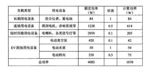 根據(jù)純電動(dòng)汽車車載電子設(shè)備的不同屬性,能把用電設(shè)備分為長(zhǎng)期用電、連續(xù)用電、短時(shí)間間歇用電和附加用電設(shè)備種類型,并賦于不同的權(quán)值。其中,長(zhǎng)期用電設(shè)備包括組合儀表和蓄電池,權(quán)值取1;連續(xù)用電設(shè)備包括雨刮、電機(jī)、音響系統(tǒng)和儀表照明等設(shè)備,權(quán)值可取0.5;短時(shí)間間歇用電設(shè)備包括電喇機(jī)、各類信號(hào)燈、控制器等設(shè)備,權(quán)值可取0.1;附加用電設(shè)備電動(dòng)真空泵、電動(dòng)水泵和電動(dòng)轉(zhuǎn)向,權(quán)值根據(jù)實(shí)際情況分別取0.1、1、0.3。各類設(shè)備所消耗功率分析如表所示。
